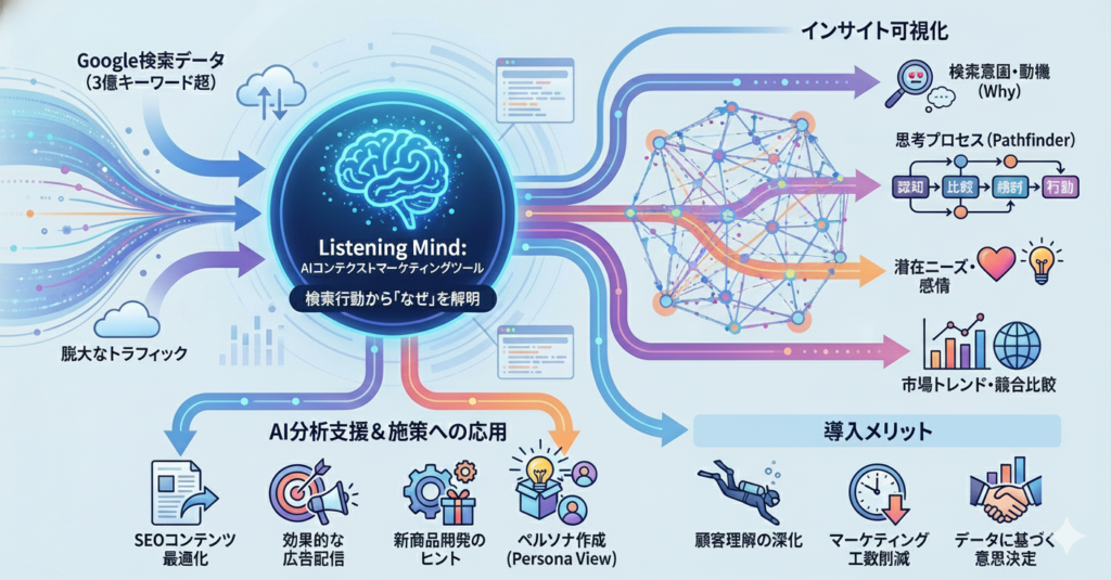 本メディアが基盤としているのが、Search Intelligence Toolである ListeningMind です。ListeningMindは、Googleの膨大な検索データを分析し、検索インテントや関心の広がり、検討プロセスを可視化することができるツールです。単なるキーワード分析にとどまらず、「なぜその検索が行われたのか」「次にどのような行動や判断が想定されるのか」といった背景まで捉えることを可能にします。