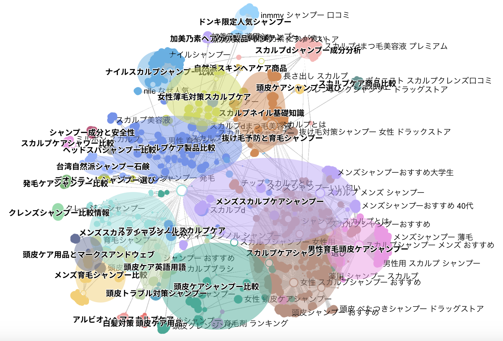 ※上図は「スカルプシャンプー」に関するマップ形式のキーワードクラスタリング結果。