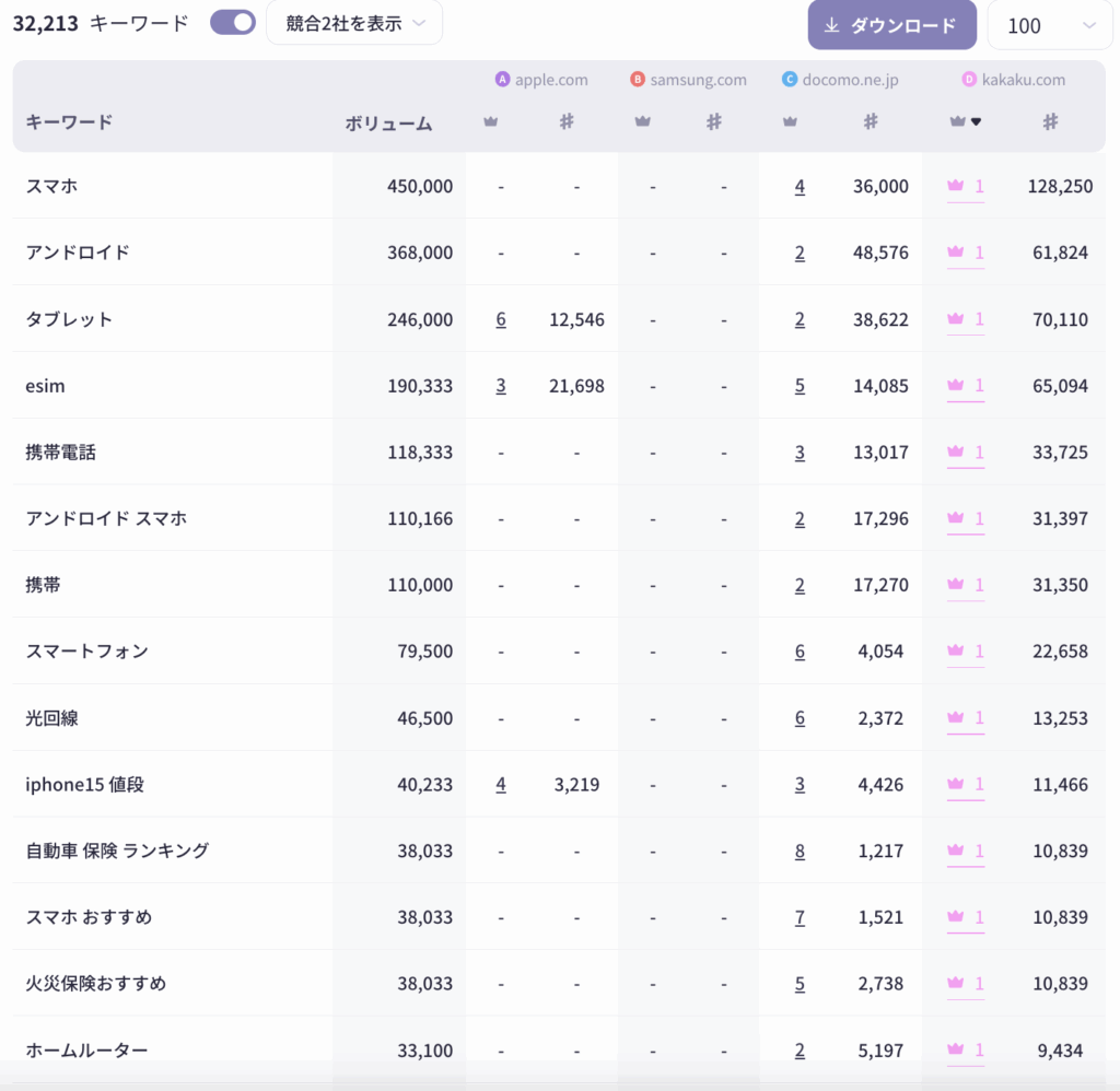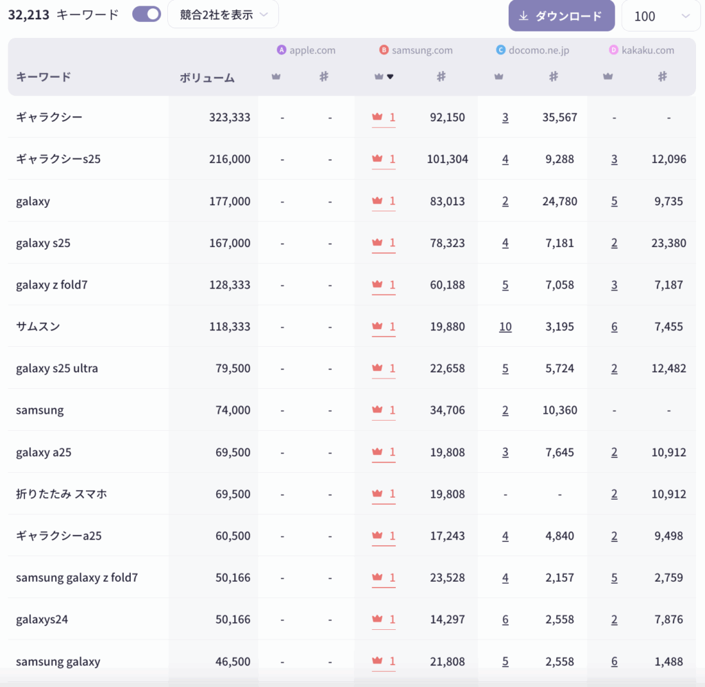競合との差分や優先すべき領域が直感的に把握できるため、次に強化すべきキーワード戦略をロジカルに導き出せます。