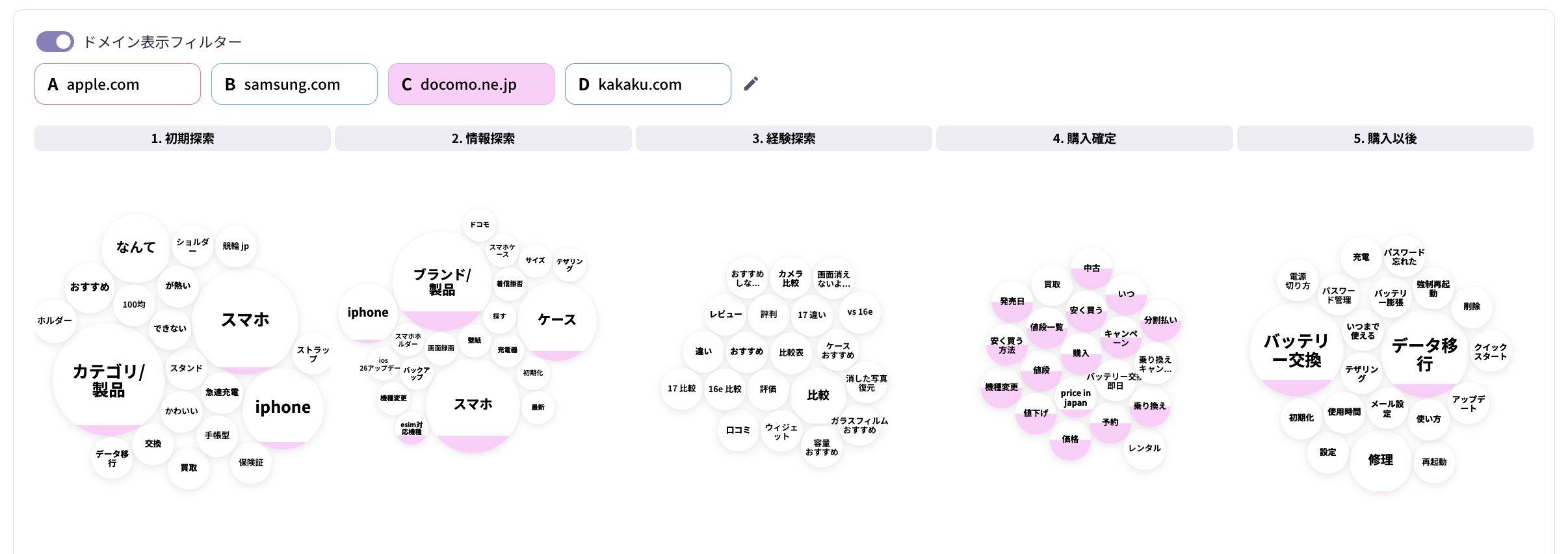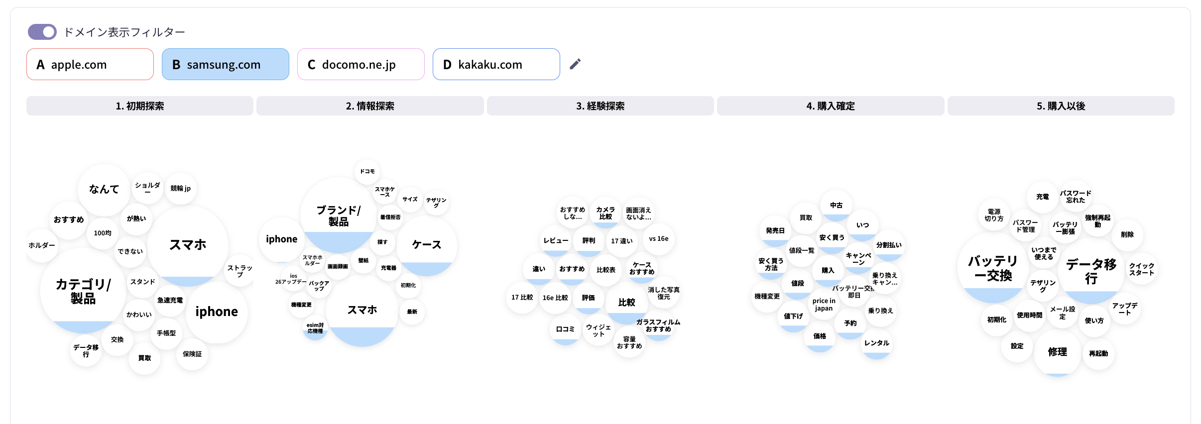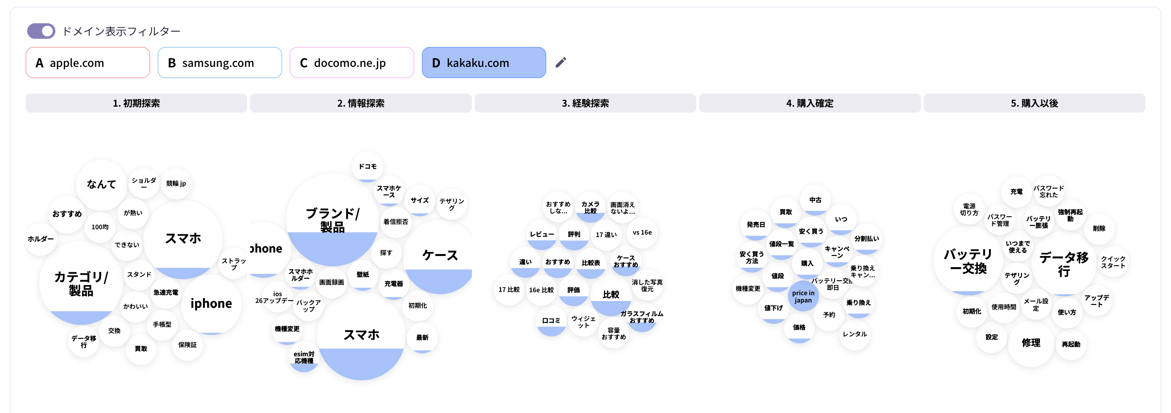 「初期探索」から「購入後」までの5つの検索フェーズごとに、検索キーワードのドメイン表示シェア(Visibility)を自動算出します。各段階でユーザーがどのタイプのサイト(公式サイト、比較サイト、メディアなど)を選択しているかを俯瞰でき、情報収集から比較・検討までの動きを立体的に把握できます。