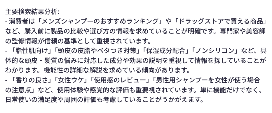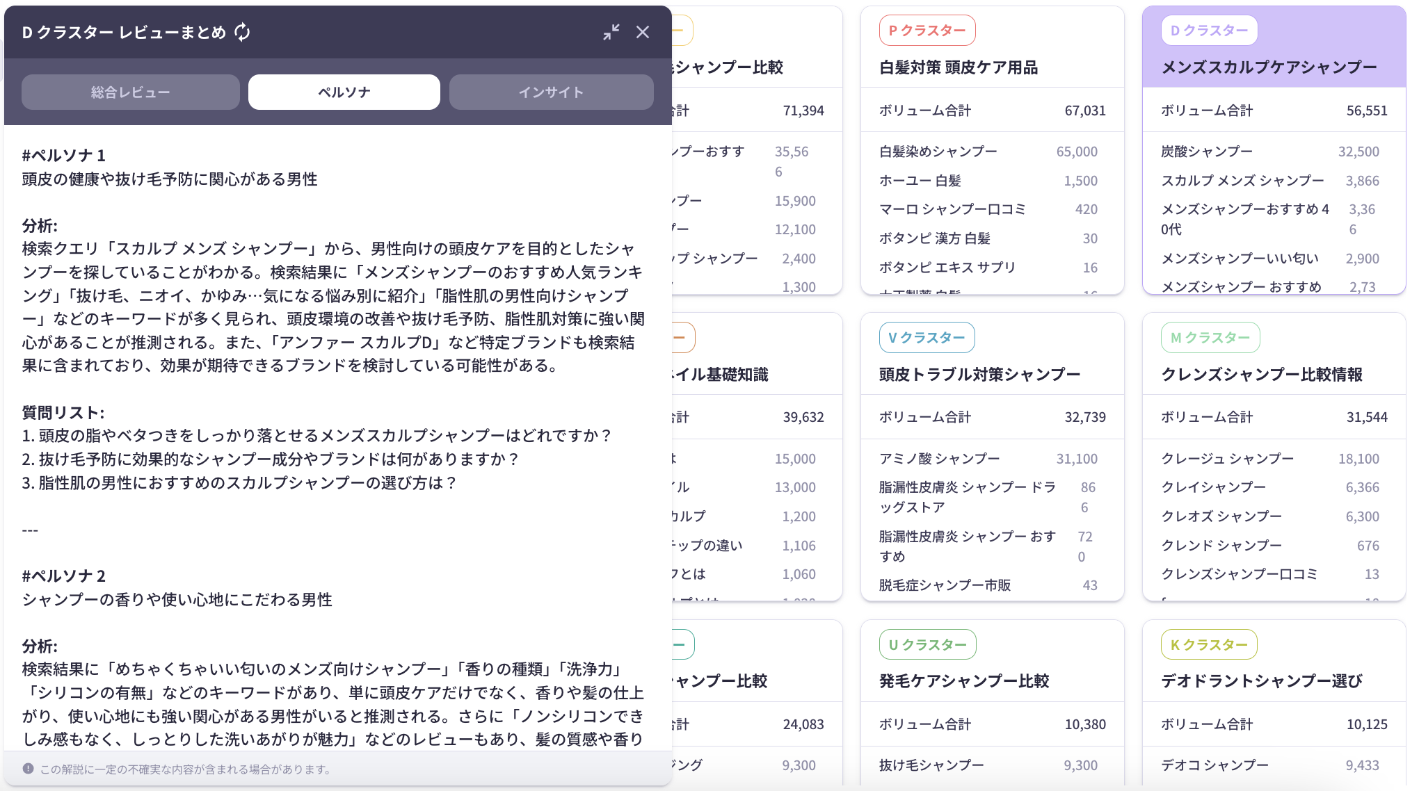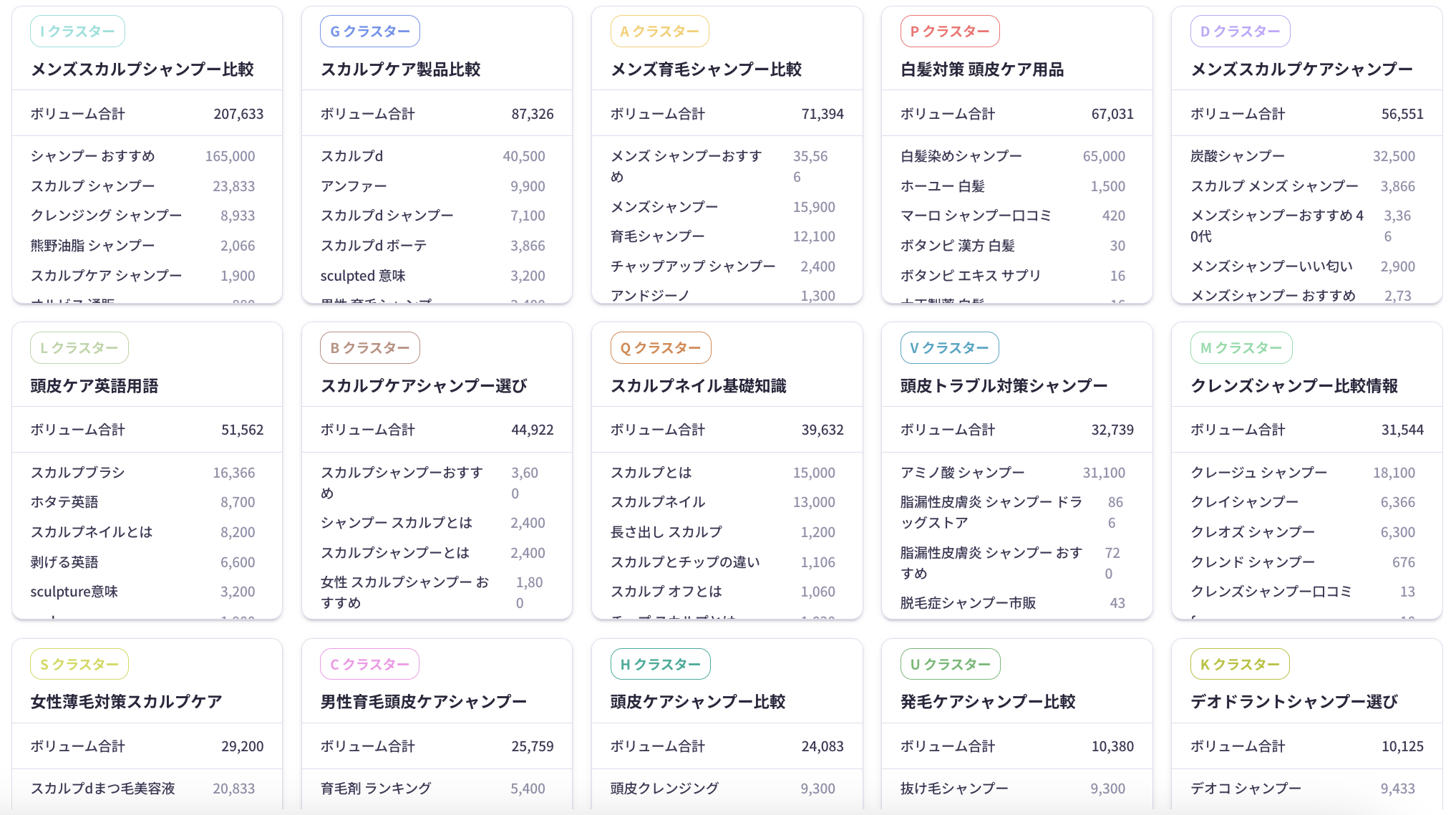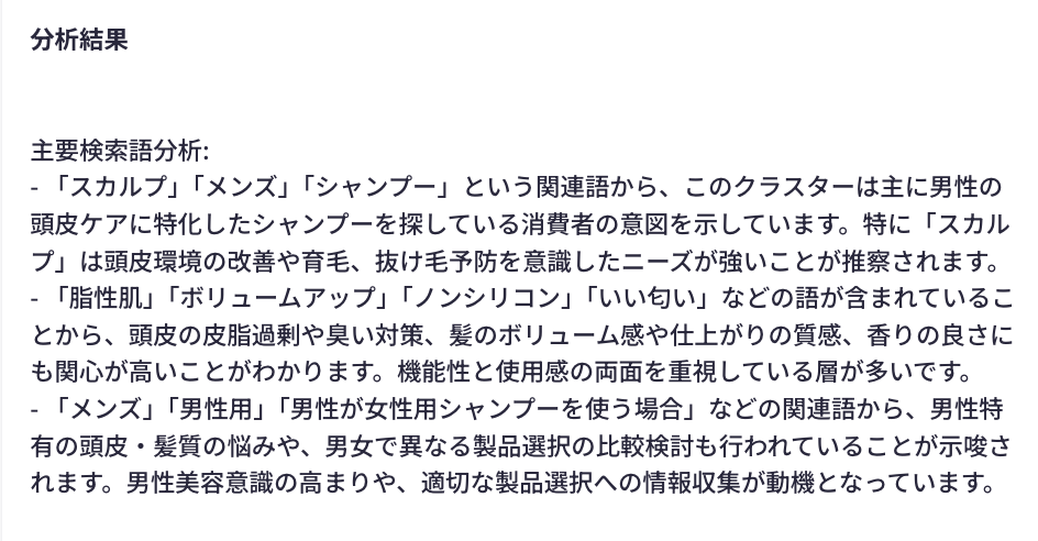 ※上記は検索クラスター「メンズスカルプケアシャンプー」の分析結果事例。