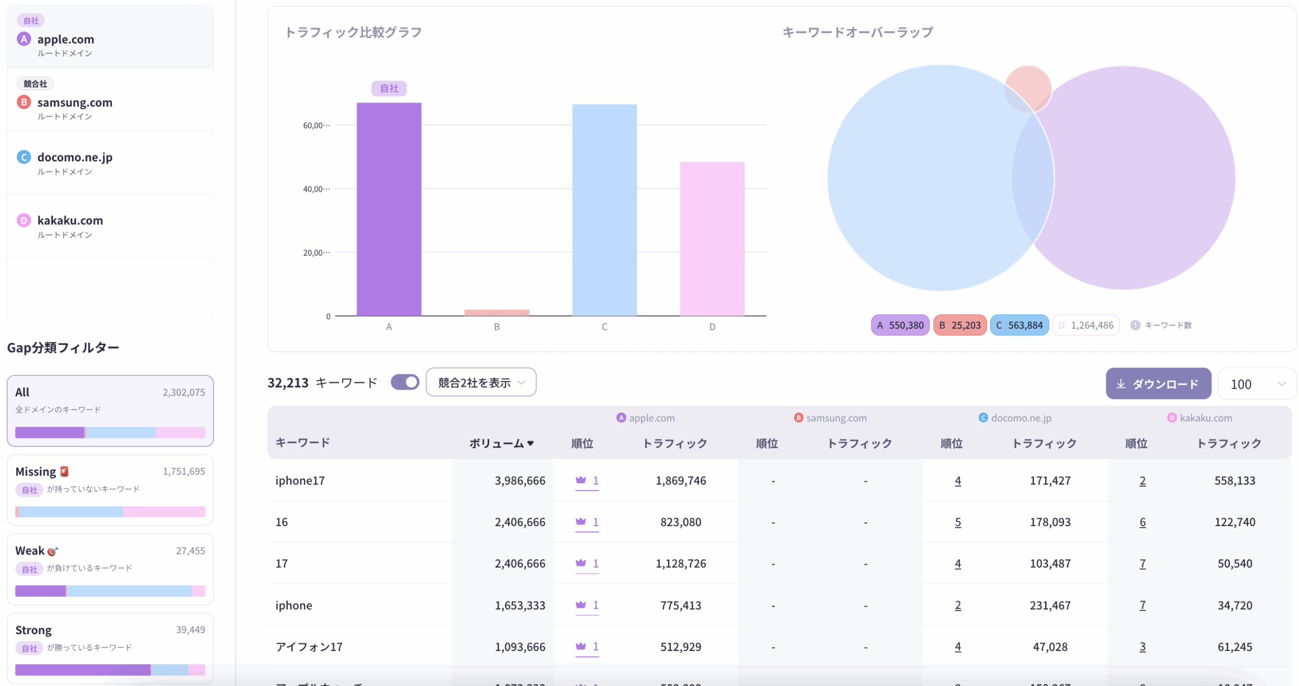 自社と競合サイトの「獲得キーワード」と「トラフィック」を横並びで比較し、勝てる領域を特定します。キーワードの重複状況はオーバーラップ図で可視化され、以下の4つに自動分類されます。