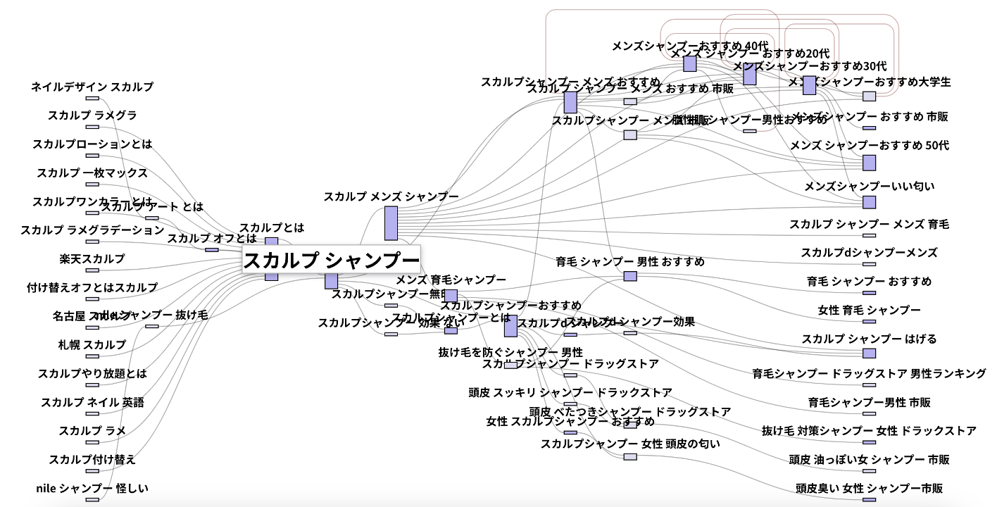 例えば「スカルプ シャンプー」から「スカルプd シャンプー」に至るまでの経路では、「効果・デメリットの確認」「市販・無印などの比較」「薄毛・抜け毛対策などのニーズ別の分岐」といった複数の流れが同時に可視化されます。