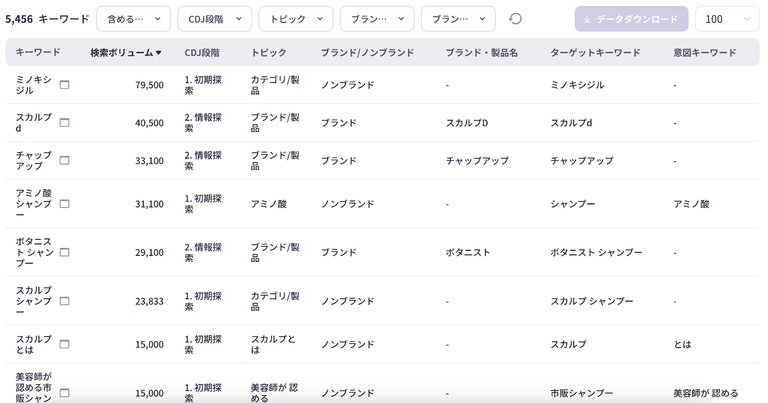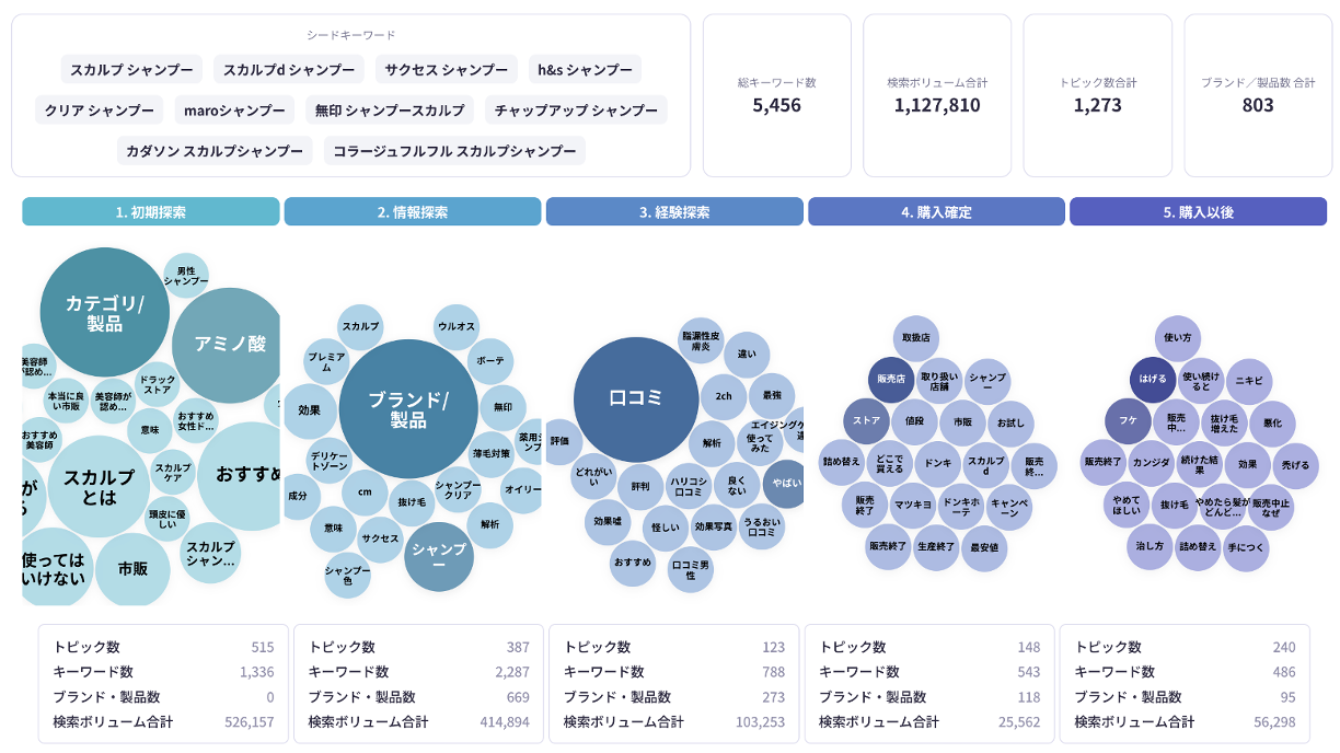 特定カテゴリやブランドを調べるユーザーが、「どんなキーワードを、どの順番で検索し、どの段階で何を知ろうとしていたのか」という一連の行動を、5つの購買ファネルに沿って体系的に可視化します。