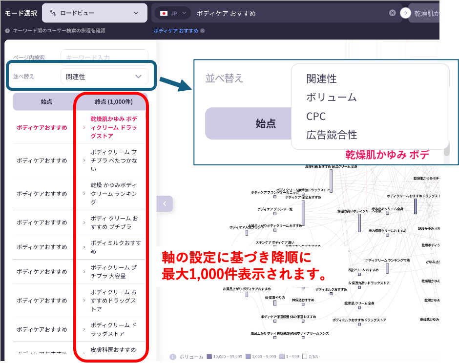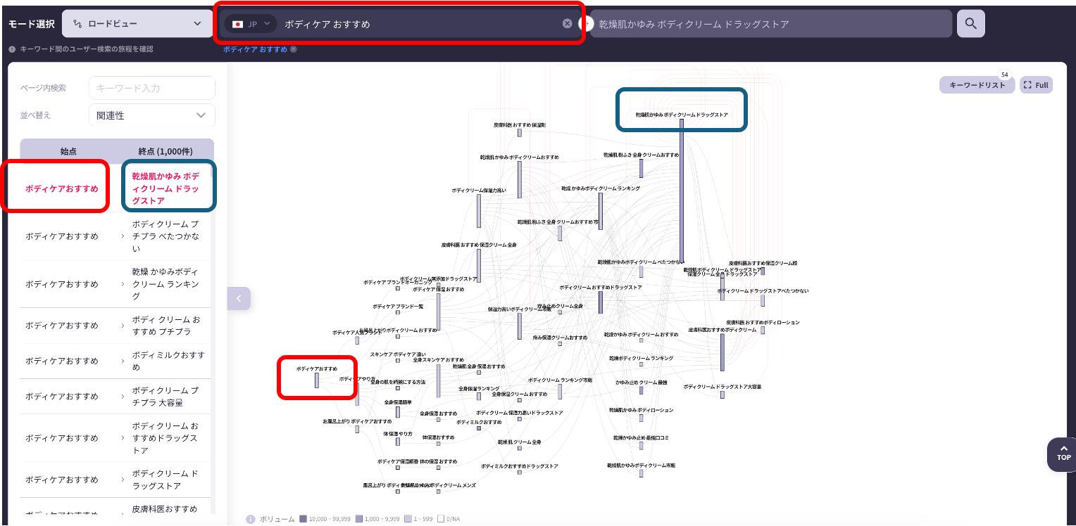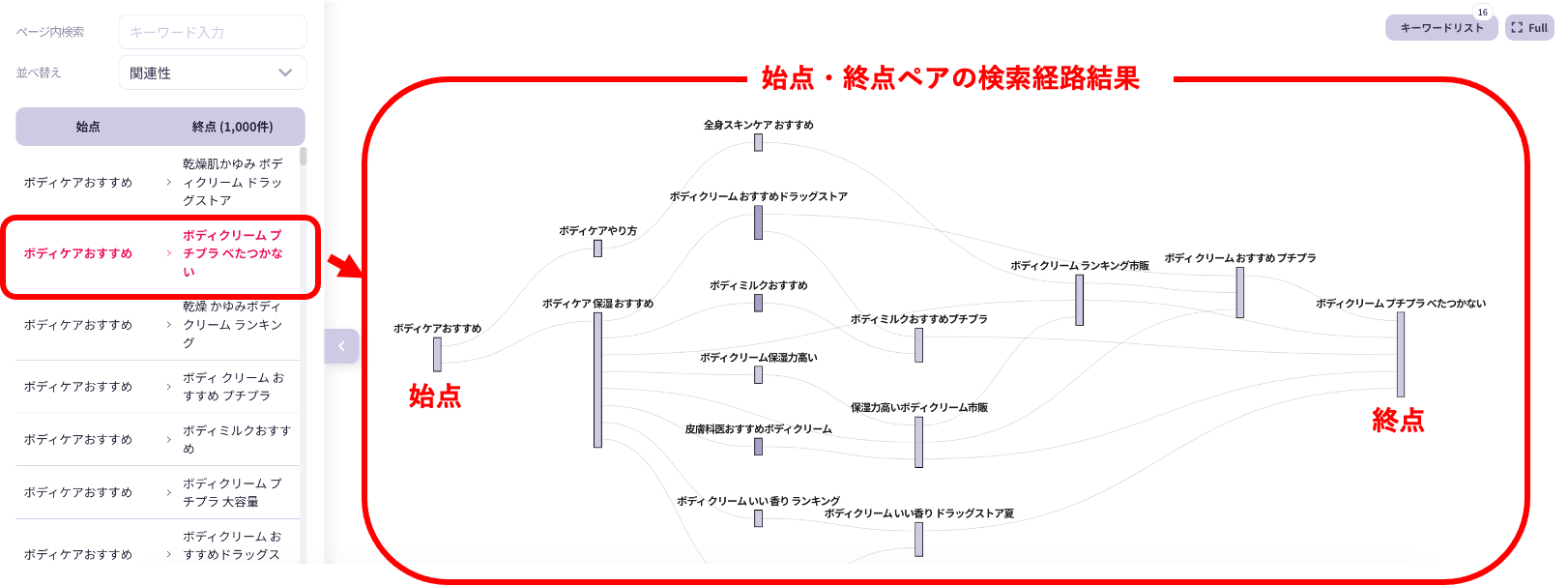 検索経路の結果は、左側のリストから任意の始点・終点のペアを選択することで、対応する検索経路が反映されます。たとえば「ボディケアおすすめ」→「ボディクリーム プチプラ べたつかない」を選択すると、それに関連する検索の流れが自動的に表示され、検索ユーザーの興味の移り変わりを視覚的に確認できます。興味のあるパスをクリックするだけで、関連経路の詳細を簡単に切り替えることが可能です。