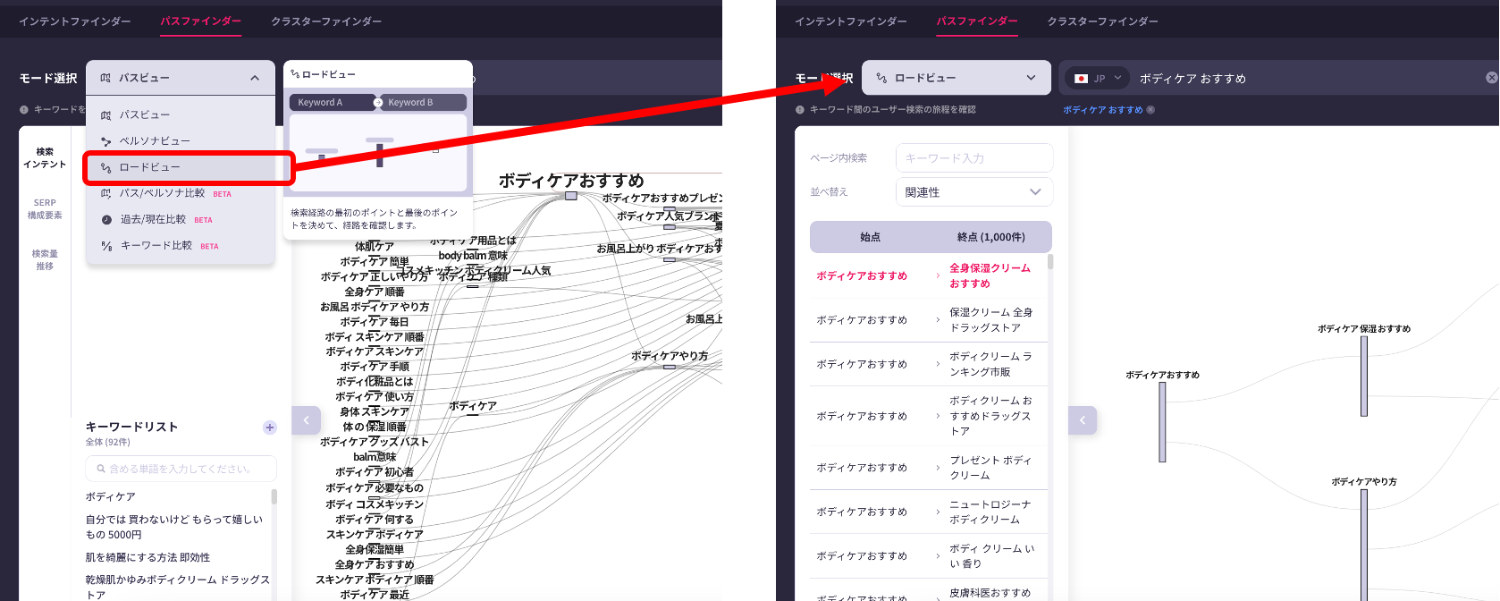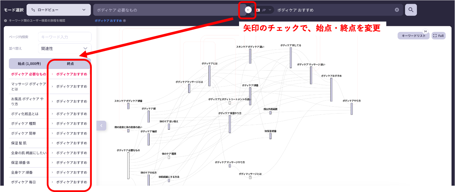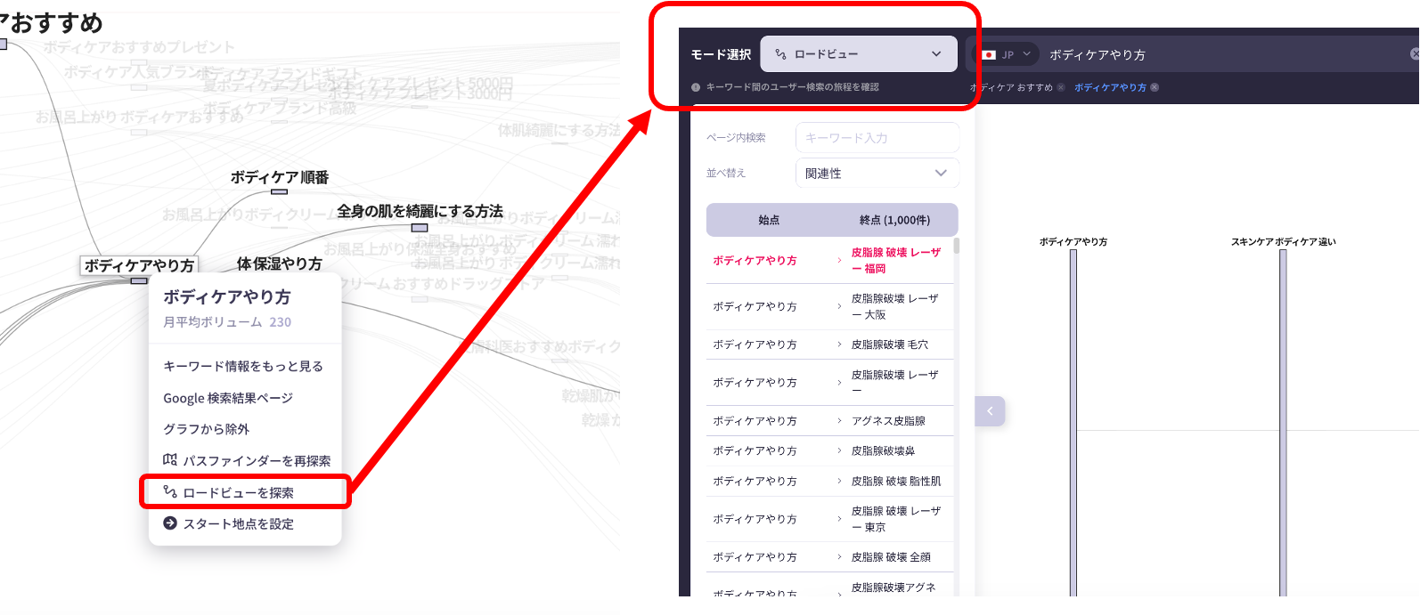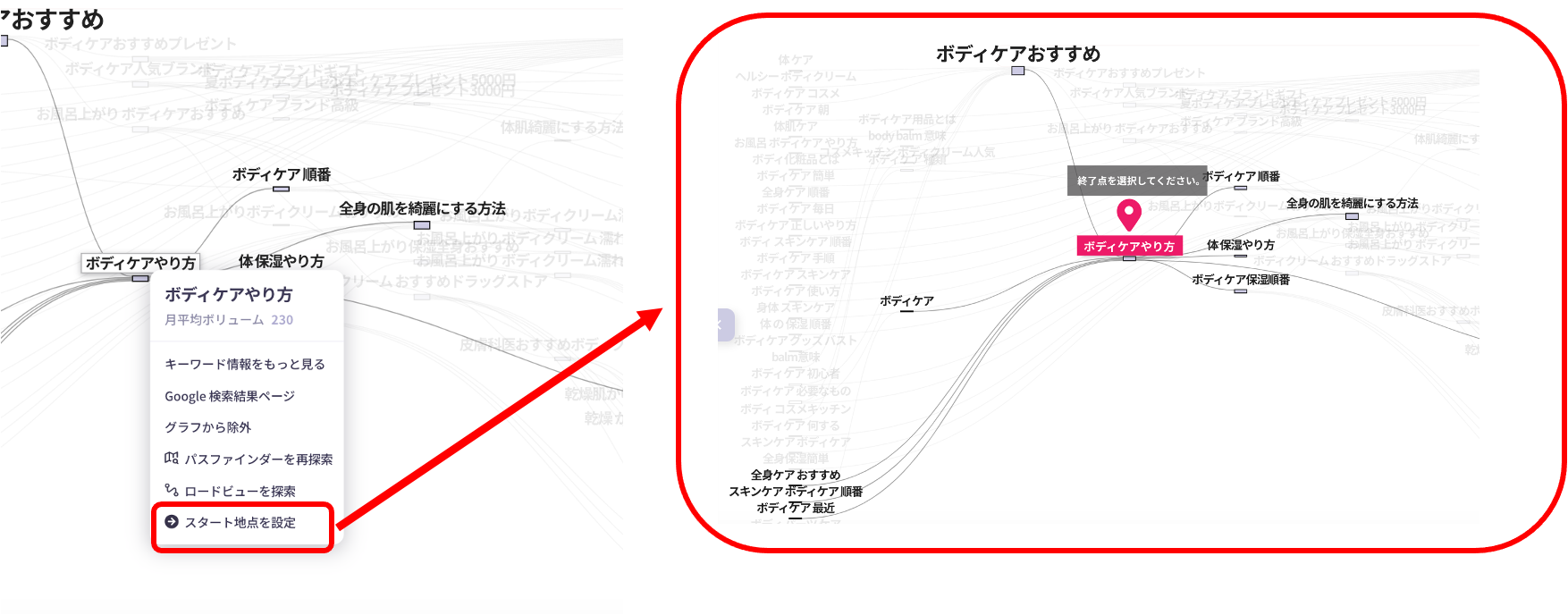 パスビューで特定キーワード(例:「ボディケアやり方」)を選択し、表示されるメニューから「スタート地点を設定」をクリックすると、ピンが立ち「始点」として選択されます。その後、終点となるキーワードを選ぶことで、「ロードビュー」にモード変更できます。