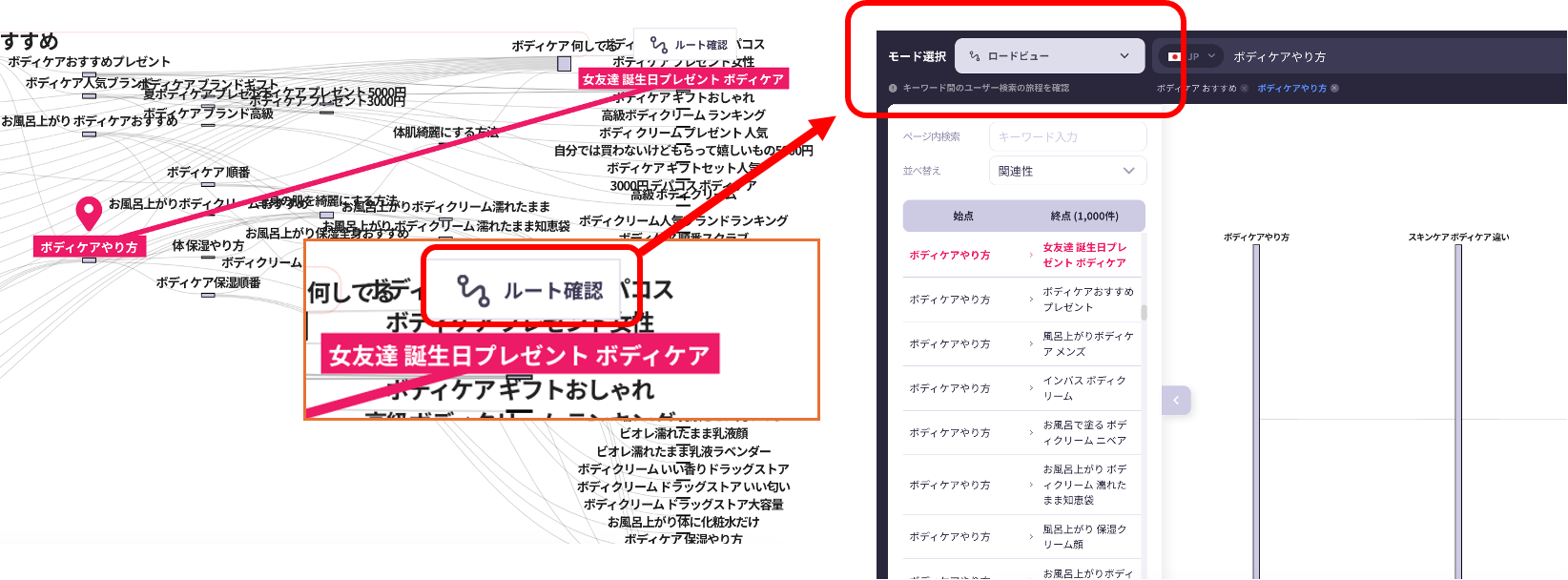 下図は、始点に「ボディケアやり方」、終点に「女友達 誕生日 プレゼント ボディケア」を選択し、「ルート確認」をクリックすることで、「ロードビューモード」へ切り替わる流れを示しています。これにより、2つのキーワード間の検索遷移を詳細に確認できます。
