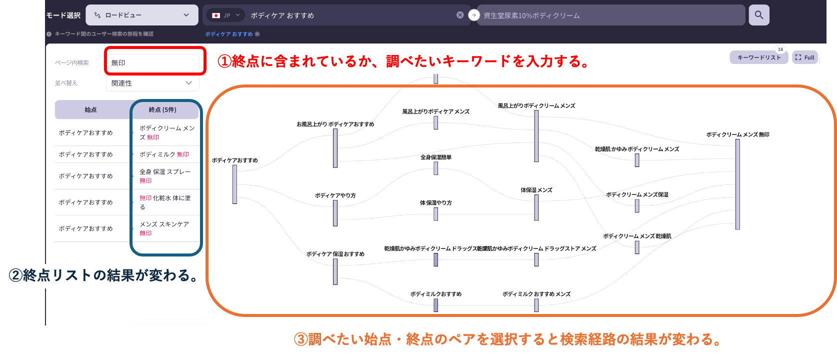 特定のキーワードで絞り込みたい場合は、画面左上の「ページ内検索」欄に調べたいキーワード(例:「無印」)を入力します。終点リスト内に該当語を含むキーワードのみが抽出され、一覧の表示内容が自動で更新されます。特定ブランドや商品名などを終点(または、始点)に検索行動を深掘りする際に有効な機能です。