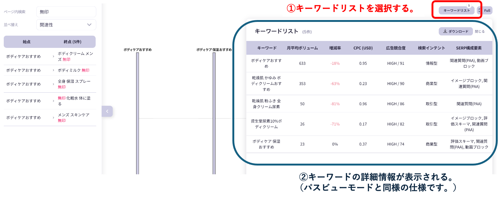 画面右上の「キーワードリスト」ボタンをクリックすると、検索経路表示画面で使用されているキーワードの詳細情報が一覧で表示されます。表示形式はパスビューモードと共通で、一覧はそのままCSV形式でダウンロードも可能です。