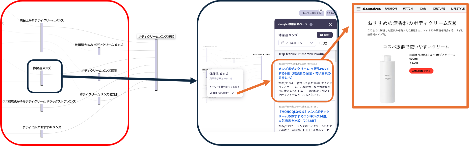 下図の流れは、検索ユーザーがどのようにしてブランド名を含むキーワードにたどり着いたかを確認する使い方の例です。たとえば、「体保湿 メンズ」での検索結果に無印良品の商品紹介記事が表示されていた場合、その情報に触れたことで、次に「ボディクリーム メンズ 無印」と検索した可能性が読み取れます。このように、前ステップの検索結果から次の検索行動への影響を可視化できます。