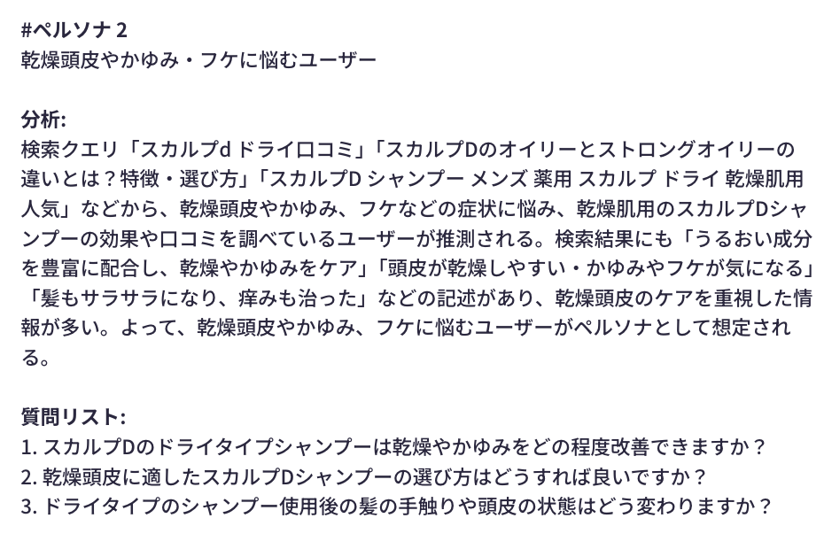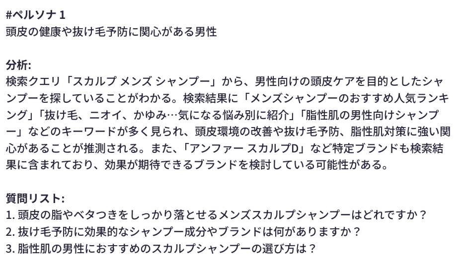 下図はListeningMindでシードキーワード「スカルプd シャンプー」の検索クラスタをペルソナ分析した事例です。質問リストとしてニーズが抽出されています。
