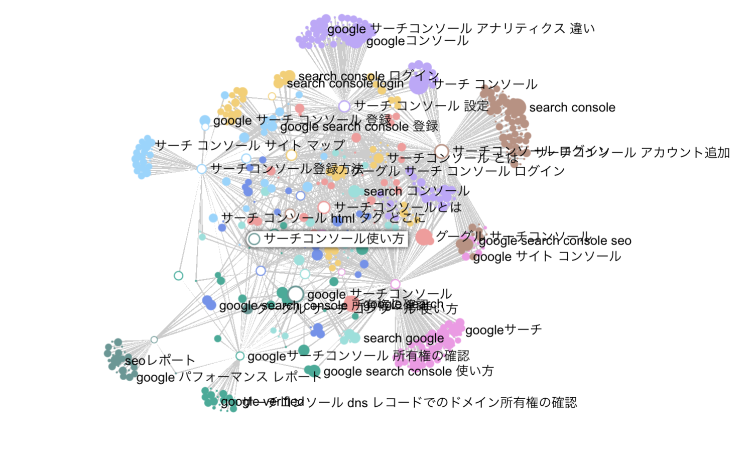 下図はListeningMindで「サーチコンソール 使い方」の関連キーワードを検索意図別にキーワードマッピングした場合の事例です。