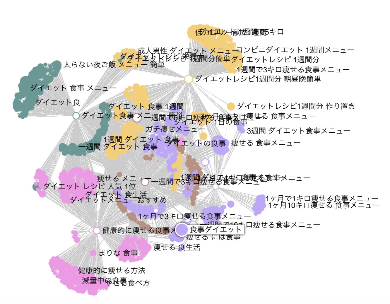 下図はListeningMindで「ダイエット 食事」の関連キーワードを検索意図別にキーワードマッピングした場合の事例です。