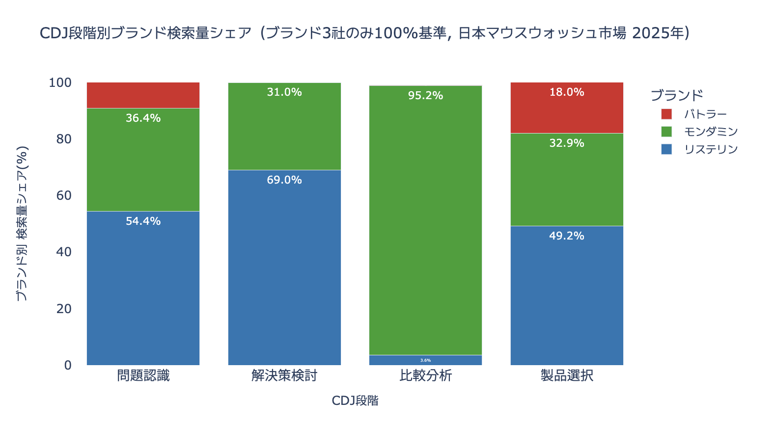 マウスウォッシュ市場における消費者の購買行動は、単なる製品選択ではなく、複数の思考プロセスを経て形成されています。ListeningMindとChatGPTを用いた分析により、検索データを軸とした「カスタマージャーニー(CDJ)」におけるブランドの影響力を可視化することが可能となりました。今回は、マウスウォッシュ市場におけるリステリン・モンダミン・バトラーの検索シェアを、4つの購買段階に沿って分析しました。