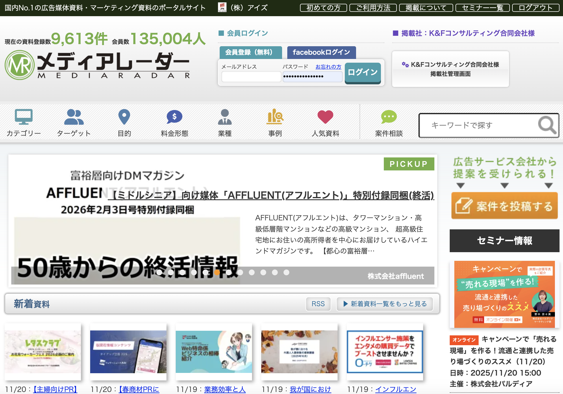 検索の起点は左側に位置する「媒体資料」「広告媒体資料」「マーケティング資料サイト」などで、広告出稿の検討や媒体情報の収集を目的に検索が始まっています。