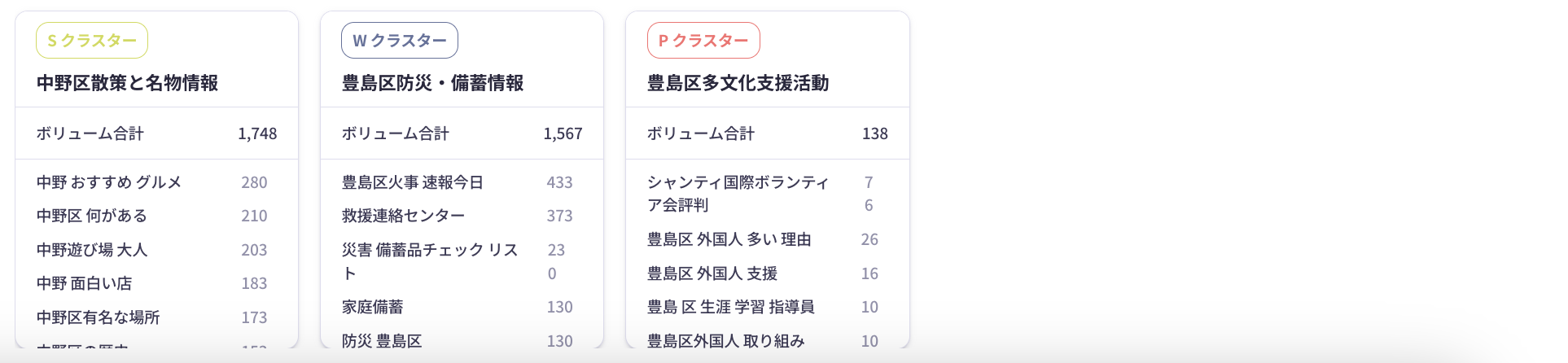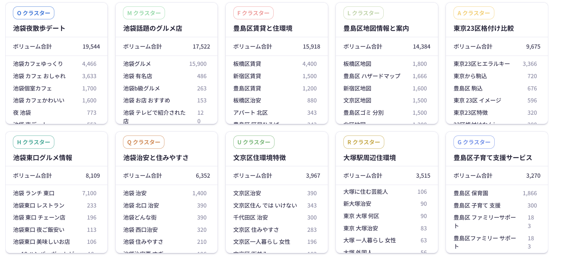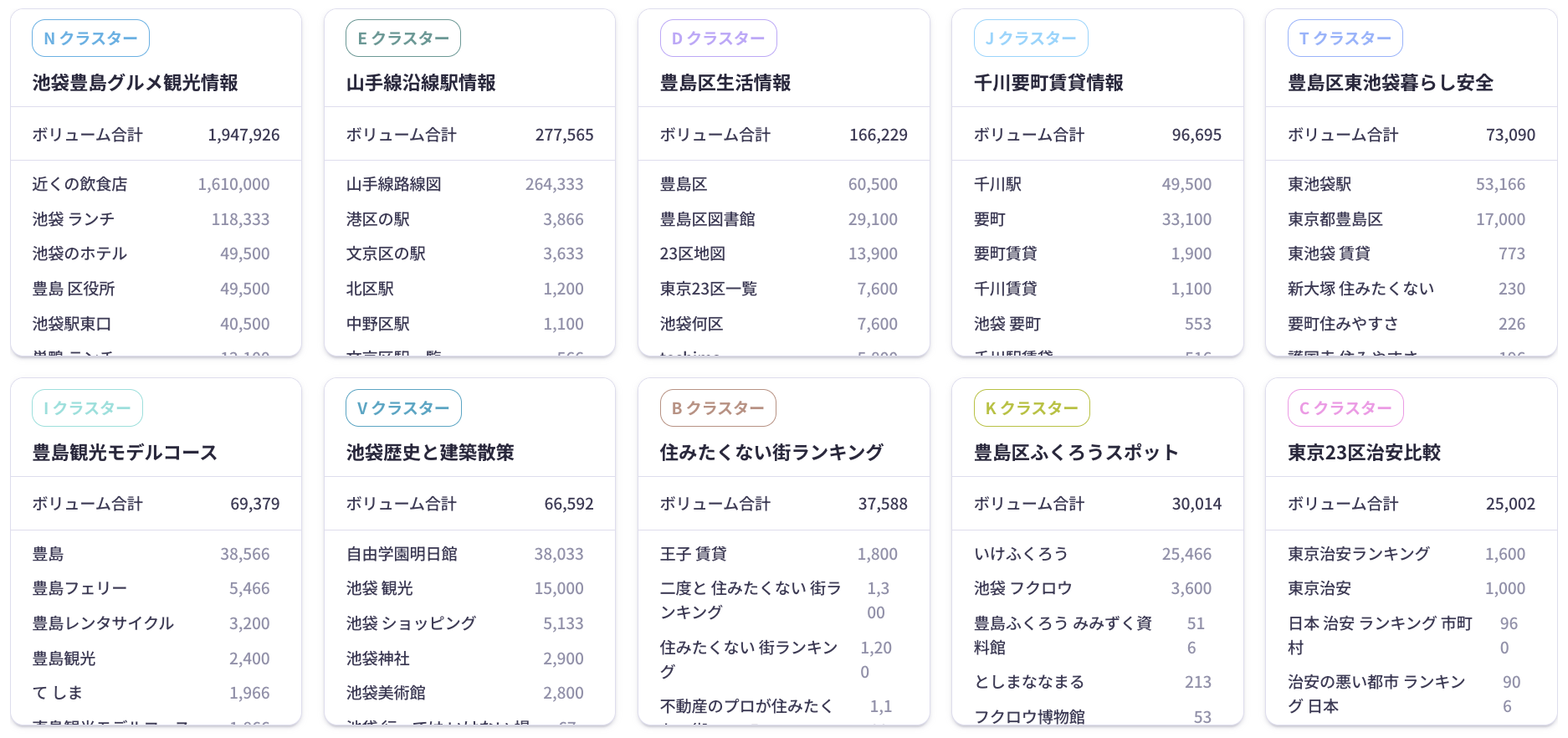 ※各クラスターに含まれるキーワード一覧と月間検索ボリュームを、カード形式で可視化