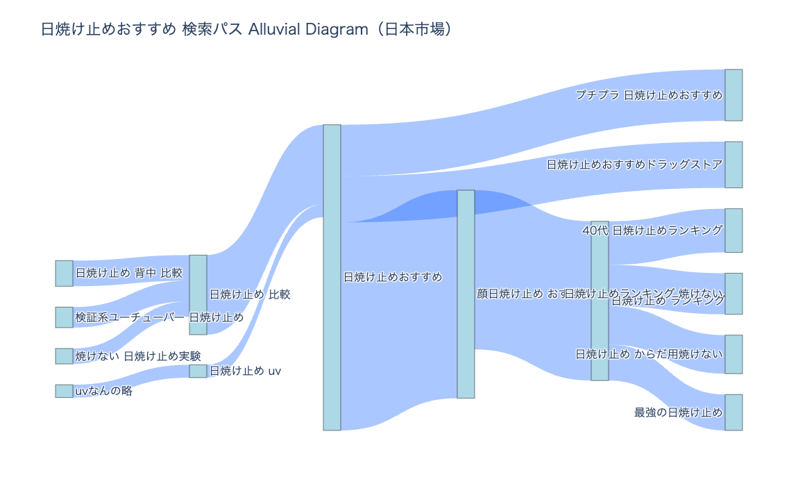 今回の調査で最も興味深い発見は、詳細なキーワード(「顔用 プチプラ」など)で検索した後、最終段階で再び「日焼け止め おすすめ」というビッグワードに戻るユーザーが非常に多いという点です。