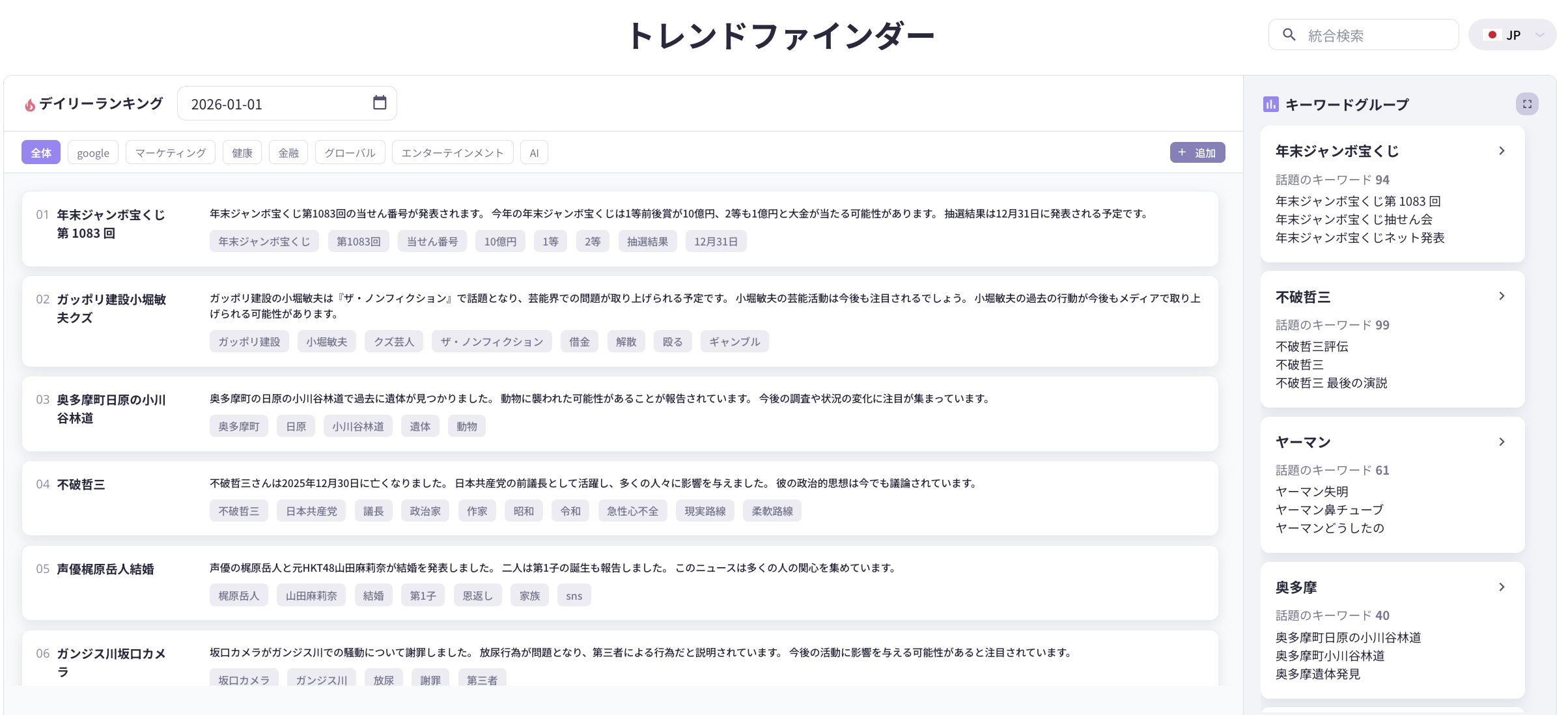 本ランキングは、検索数の伸びに加え、関連キーワードの広がりやトピック全体の注目度を評価する独自指標により重要度順で算出しています。単なる検索ボリュームでは見えにくい、今まさに注目されているテーマや次に来るトレンドの兆しを把握でき、コンテンツ企画やマーケティング施策のヒントとしてご活用いただけます。
